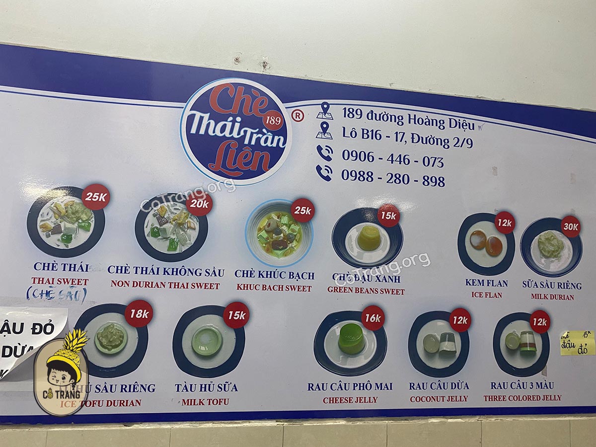 Chè Liên tại 189 Hoàng Diệu, Hải Châu, Đà Nẵng, là một trong những địa điểm không thể bỏ qua nếu bạn yêu thích món chè. Với thực đơn đa dạng, quán nổi bật nhờ món Chè Thái Sầu Riêng siêu ngon, mang đến hương vị độc đáo và khó quên cho thực khách. Đặc biệt, giá cả ở đây rất hợp lý, chỉ từ 5.000đ đến 25.000đ, phù hợp với mọi người.