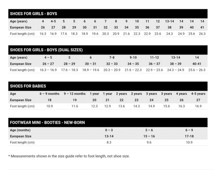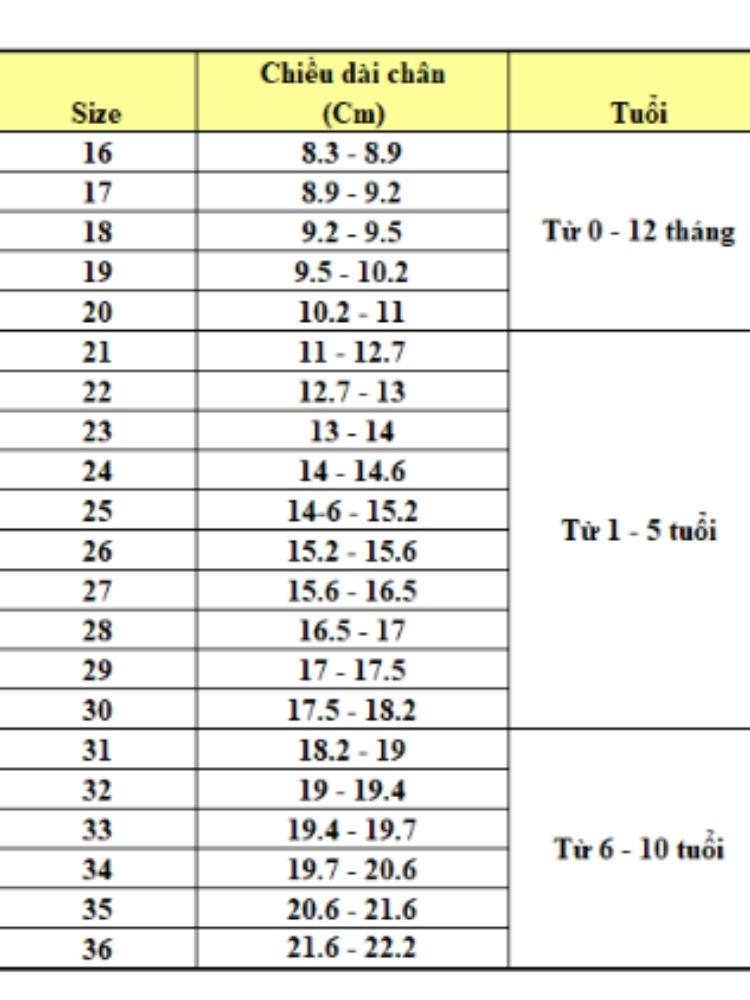 Bảng hướng dẫn đo size các bậc phụ huynh có thể tham khảo sẽ cung cấp thông tin cụ thể về tuổi, kích cỡ và chiều dài chân để lựa chọn size giày chính xác nhất cho bé. Hãy nhớ, mỗi mẫu giày có thể có sự khác biệt về kích cỡ, vì vậy việc kiểm tra kỹ lưỡng sẽ giúp bạn chọn được đôi giày thích hợp nhất cho bé yêu!