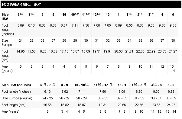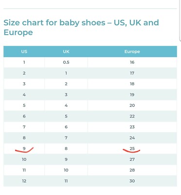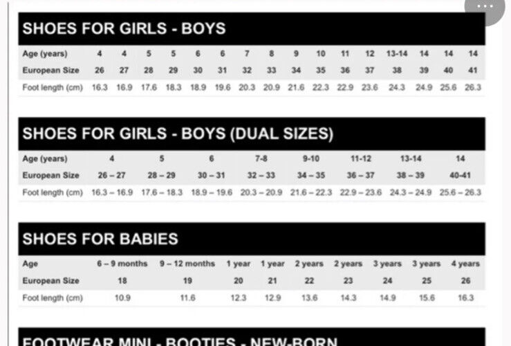 Trong bảng size, hệ thống EU là phổ biến nhất tại Châu Âu, trong khi cỡ Anh và Mỹ cũng được đưa ra để mọi người dễ dàng tham khảo. Theo cỡ Anh, size giày được chia thành từ 2 đến 9, trong đó 2 là size nhỏ nhất. Với cỡ Mỹ, kích thước bắt đầu từ 5 trở lên. Điều này giúp mẹ dễ dàng hơn trong việc tìm ra cỡ giày phù hợp cho bé.