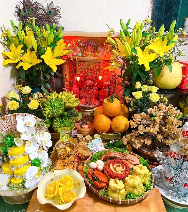 Bên cạnh bộ tam sên, trái cây ngũ quả cũng là một phần quan trọng trong mâm cúng. Những loại trái cây như thanh long, mãng cầu, bưởi, dứa và Phật thủ được chọn lựa cẩn thận, đảm bảo tươi ngon, giúp mang lại vận may trong năm. Ngoài ra, hoa tươi như hoa hồng đỏ, cúc vàng hay lay ơn cũng không thể thiếu, cho mâm cúng thêm phần trang trọng.