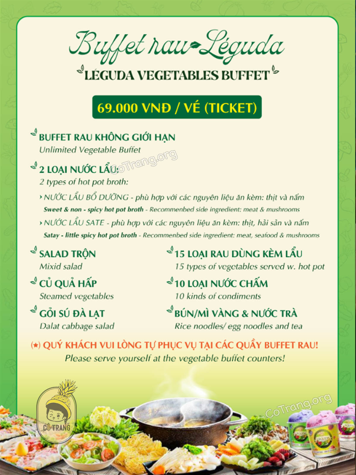 Nhà hàng buffet rau Leguda tại Đà Lạt được mệnh danh là thiên đường rau củ, là điểm đến lý tưởng cho những ai yêu thích ẩm thực tươi ngon. Chỉ với 59.000đ, bạn đã có ngay một nồi lẩu uyên ương với hai vị sa tế chua cay và vị ngọt bổ dưỡng. Đặc biệt, mỗi vé buffet không chỉ bao gồm lẩu mà còn có rau trộn và củ quả đa dạng.