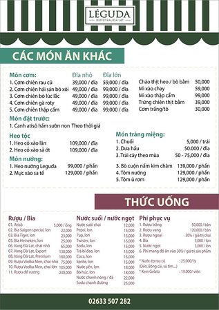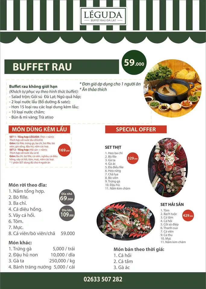 Nếu bạn muốn thêm hải sản hay các món thịt để tăng thêm phần phong phú cho bữa ăn, chỉ cần gọi thêm theo menu. Thực đơn đa dạng và phong phú, chắc chắn sẽ làm hài lòng cả những thực khách khó tính nhất. Còn chần chừ gì mà không đến Léguda để thưởng thức buffet rau Đà Lạt ngay thôi!