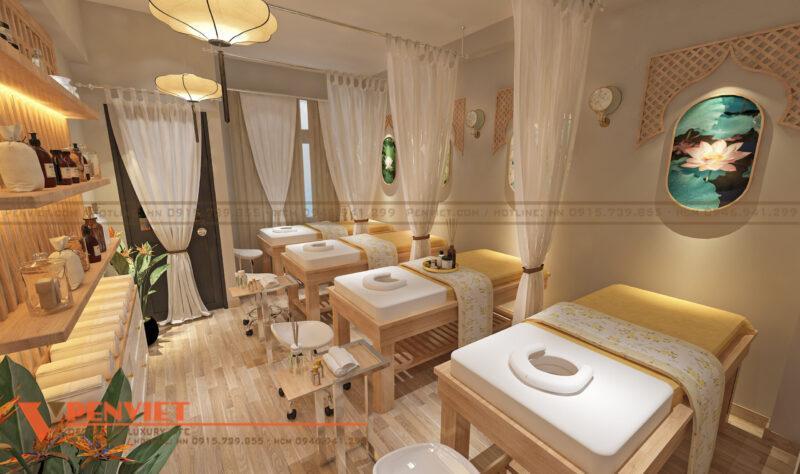 Không gian spa được thiết kế phong cách Indochine, với màu sắc nhẹ nhàng và các họa tiết độc đáo, tạo cảm giác gần gũi nhưng vẫn sang trọng. Mỗi buổi massage đều được lên kế hoạch tỉ mỉ, giúp giảm căng thẳng và làm mới các giác quan bằng những kỹ thuật chuyên nghiệp cùng dầu massage cao cấp.