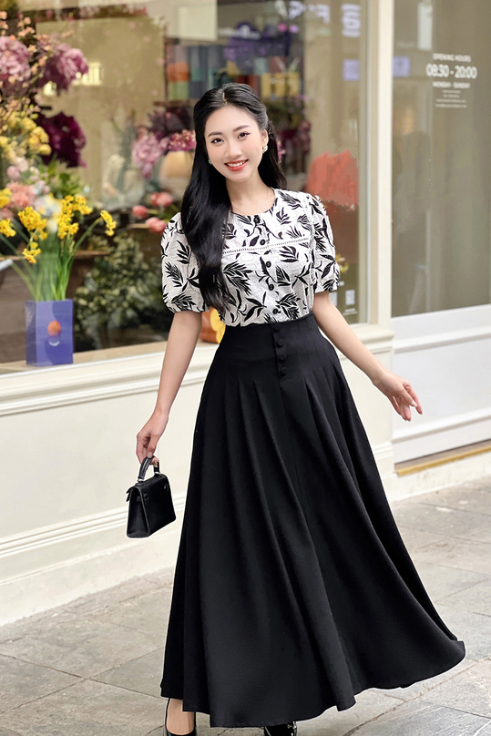 Nếu bạn đang tìm kiếm sự mới mẻ cho outfit, chân váy chữ A đen có thể được phối với áo croptop hoặc áo ống có gam màu trung tính. Để hoàn thiện bộ trang phục, một chiếc áo khoác màu sáng sẽ thêm phần nổi bật và phong cách. Không chỉ vậy, bạn có thể dễ dàng phối chân váy chữ A dài với áo sơ mi hoặc áo thun để tạo sự thanh lịch cho ngày đi làm.