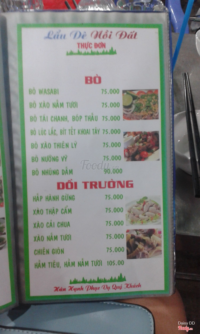 Menu tại Lẩu Dê Nồi Đất vô cùng đa dạng, với hơn 50 món ăn chế biến từ thịt dê nổi tiếng. Giá cả tại đây cũng rất phải chăng, phù hợp cho những bữa ăn bình dân. Tuy nhiên, một số thực khách cho rằng giá các món gọi kèm có phần cao hơn so với mong đợi.