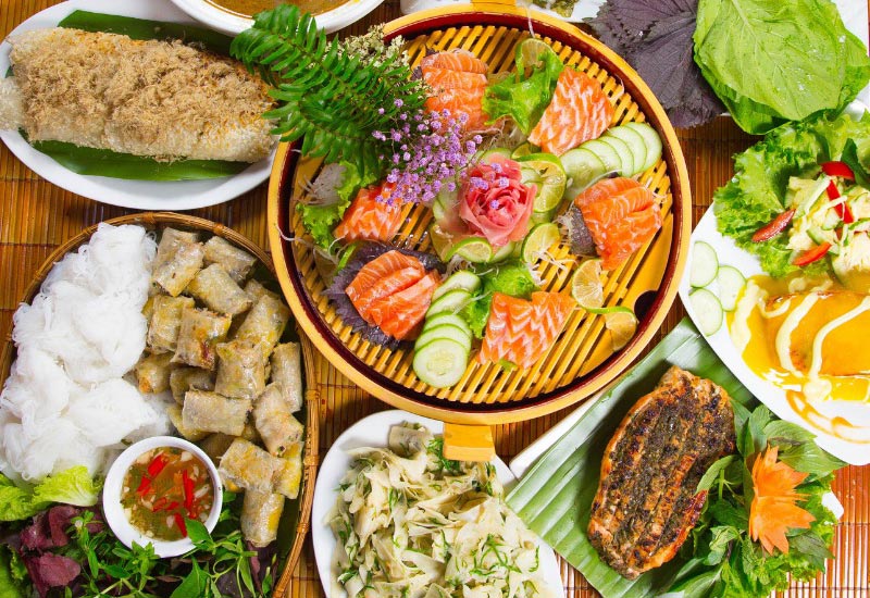 Thực đơn nơi đây rất đa dạng và phong phú, nổi bật với những món ăn đặc trưng như cá lăng nướng Tây Bắc, gà nướng bản ngon, hay rau rừng chấm sốt trứng cá. Đặc biệt, món cá hồi trong combo độc lạ cũng là một lựa chọn không thể bỏ qua.