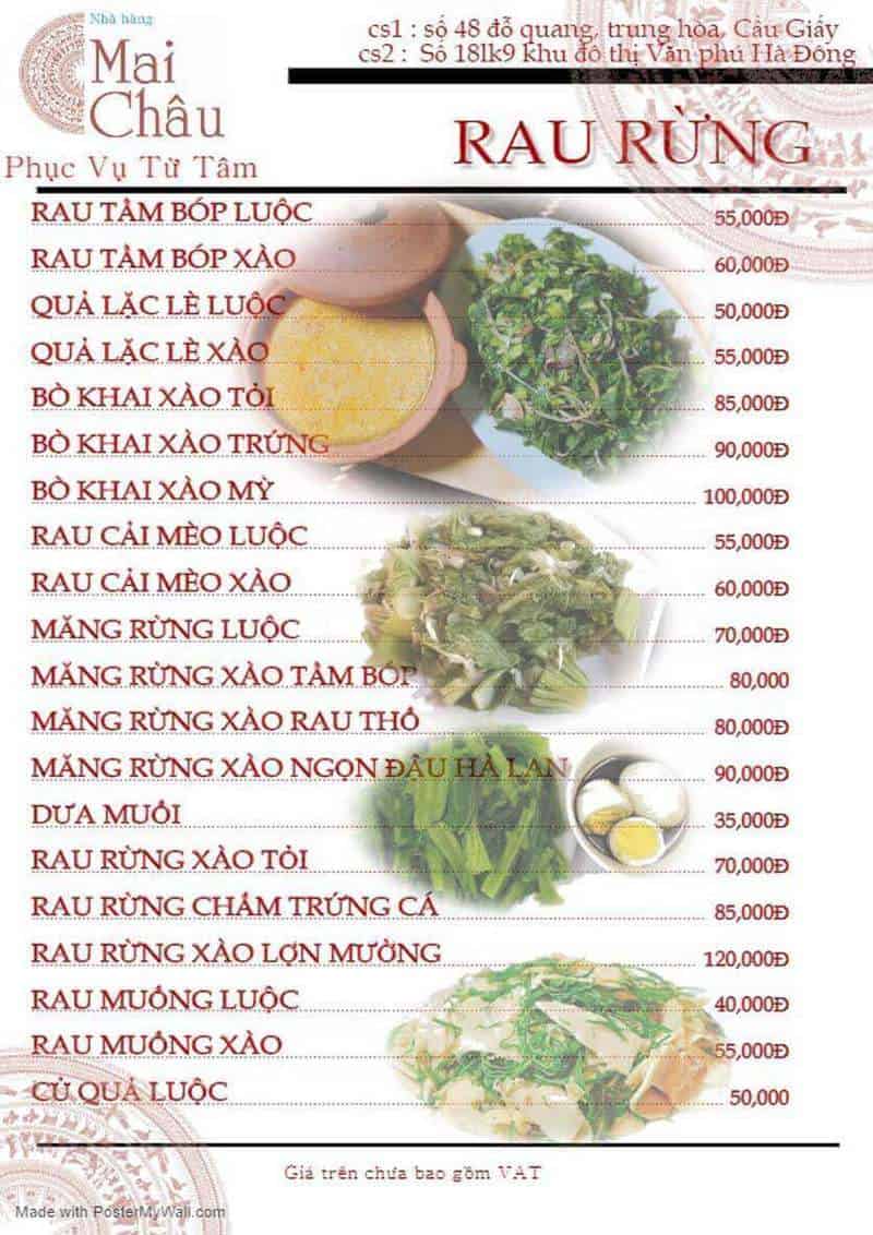 Giá cả tại nhà hàng cũng rất hợp lý, chỉ từ 150.000 đến 250.000 VNĐ/người, khiến cho Mai Châu trở thành sự lựa chọn tuyệt vời cho những ai yêu thích ẩm thực và muốn trải nghiệm hương vị miền núi. Nhà hàng hoạt động từ 10h00, hứa hẹn sẽ mang đến cho bạn những bữa ăn ngon miệng và những kỷ niệm đáng nhớ.