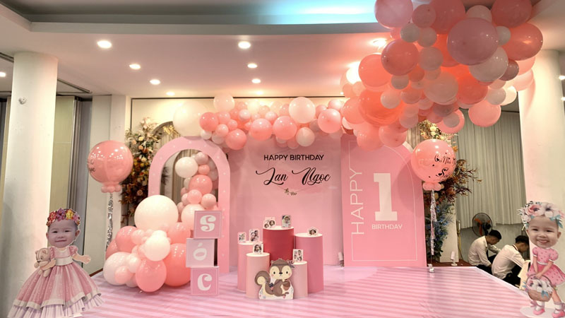 Tham khảo những bộ trang trí theo chủ đề mà bé yêu thích, điển hình như công chúa, với bóng bay đủ màu sắc và backdrop đẹp mắt sẽ khiến không gian trở nên sinh động. Bóng bay là món đồ không thể thiếu, không chỉ giúp bữa tiệc thêm phần rực rỡ mà còn tạo không khí vui tươi cho các bé.